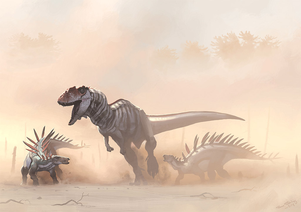 chungkingosaurus se protégeant d’un espèce d’allosaure