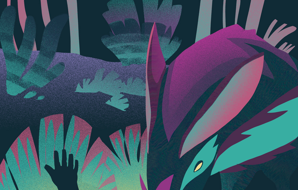 Ambiance de nuit avec des plantes bioluminescentes, la bête dévore le cadavre de madame sepia